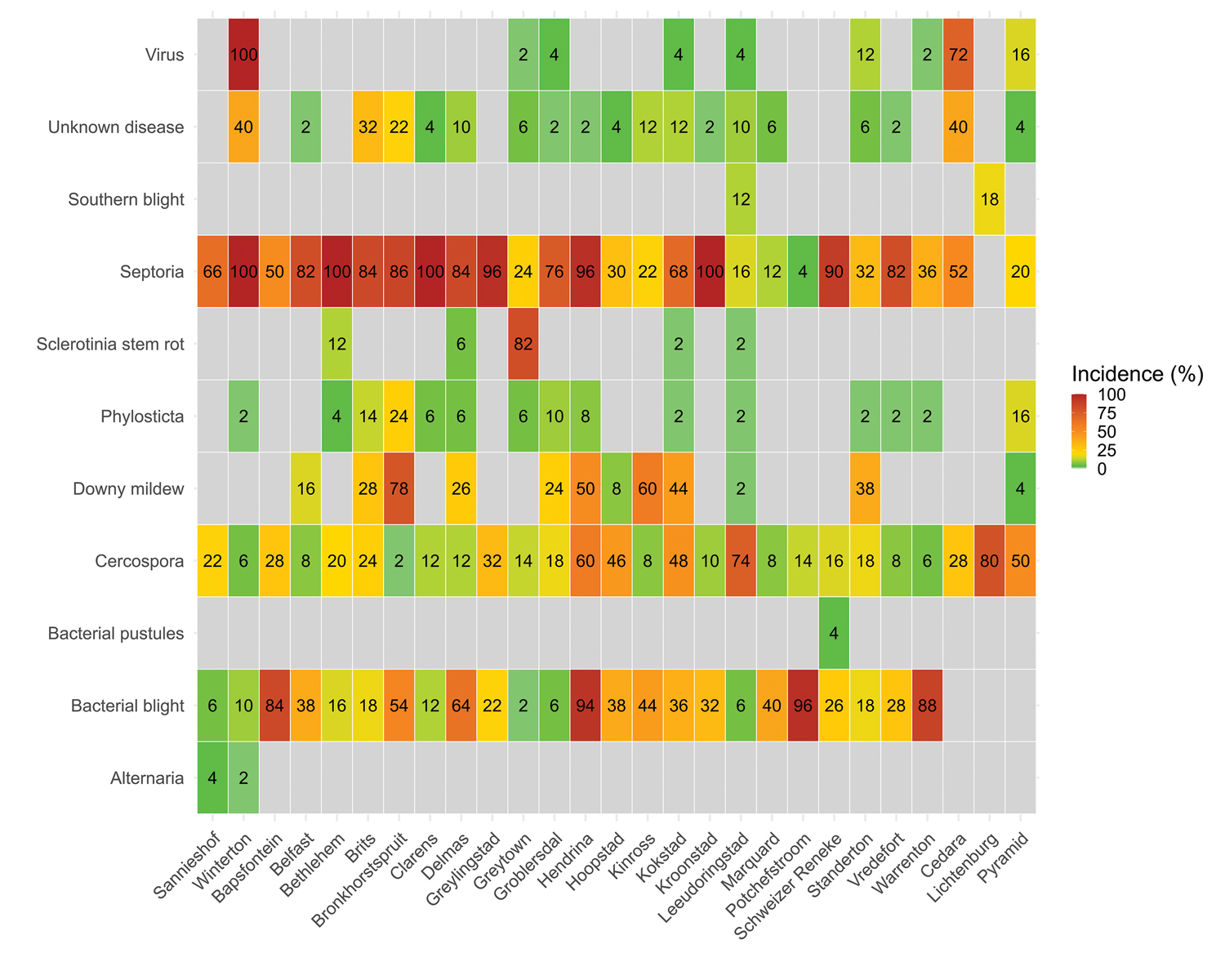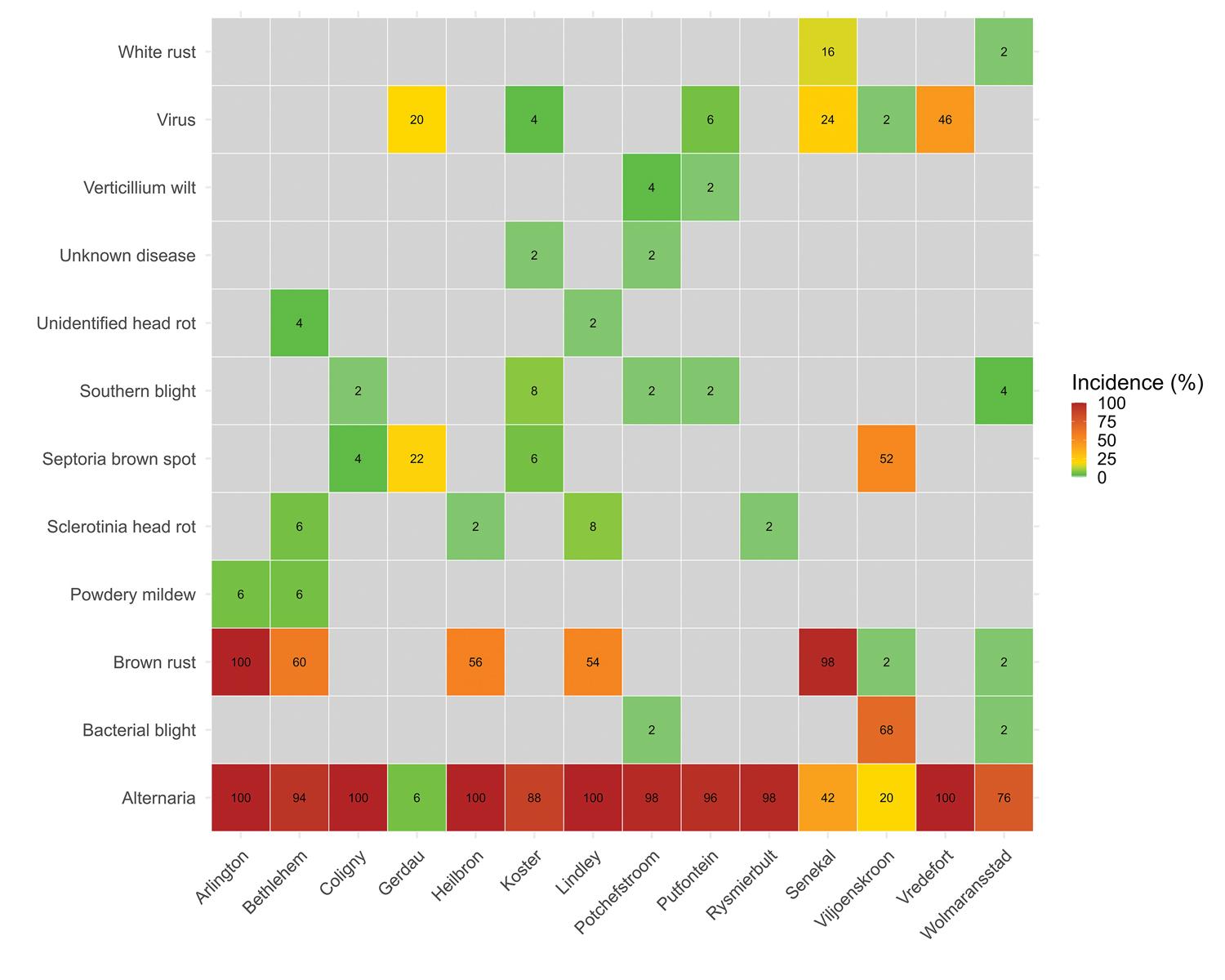 Figure 1: Heat map of average sunflower disease incidence at each location. Values represent the incidence of each disease recorded at the site nearest to the surveillance point. For example, if all 50 plants showed Alternaria symptoms, the incidence was 100%, whereas 27 infected plants out of 50 corresponded to a 54% incidence for brown rust. Grey blocks indicate that the disease was not observed at that site.