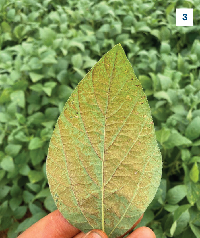 A sunburn symptom appears on the underside of the soybean leaf.