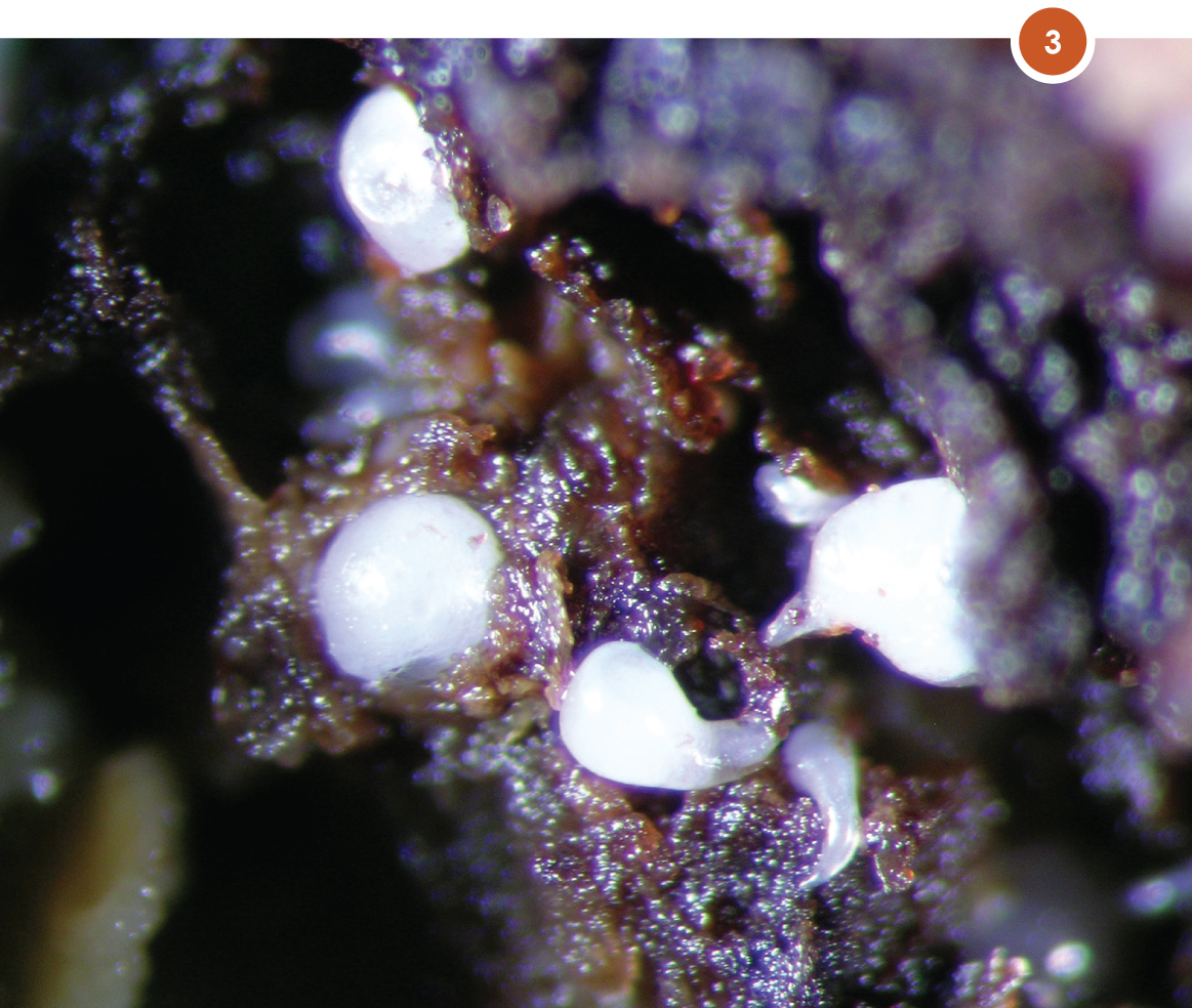 Root-knot nematodes have four life stages. The first stage (J1) moults in the egg to produce the second stage juvenile (J2). This one is the infective juvenile, which enters and damages groundnut roots. Upon entering the root, it causes only slight mechanical injury except if there are large numbers of these juveniles. As the juvenile starts to feed on the vascular cells of the root, giant cells develop around its head. Increase in the cell size result in the disorganisation of the vascular tissue and the formation of galled tissue (Photo 2).
