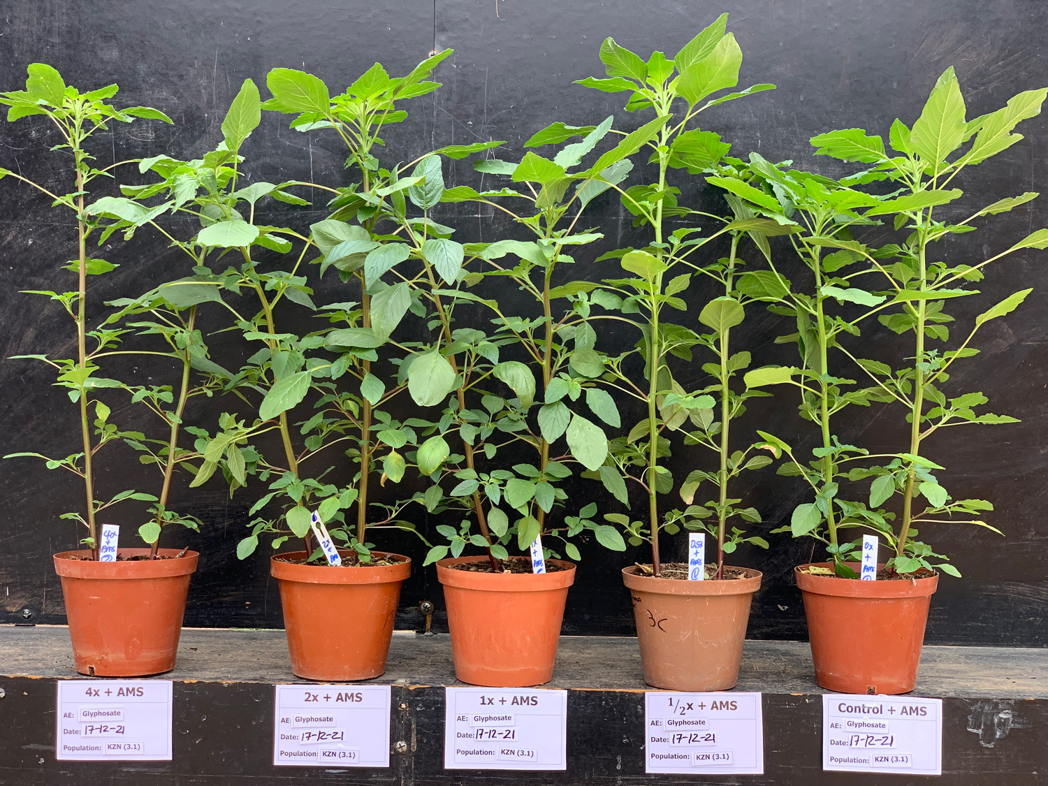 Volslae weerstand teen glifosaat in ’n Amaranthus hybridus-populasie in KwaZulu-Natal. Daar is geen noemenswaardige reaksie nie op ’n glifosaatdosisreeks wat dosisse van 2x (4 L/ha) en 4x (8 L/ha) die geregistreerde dosis (1x = 2 L/ha) insluit. (Bron: SAHRI by UP)