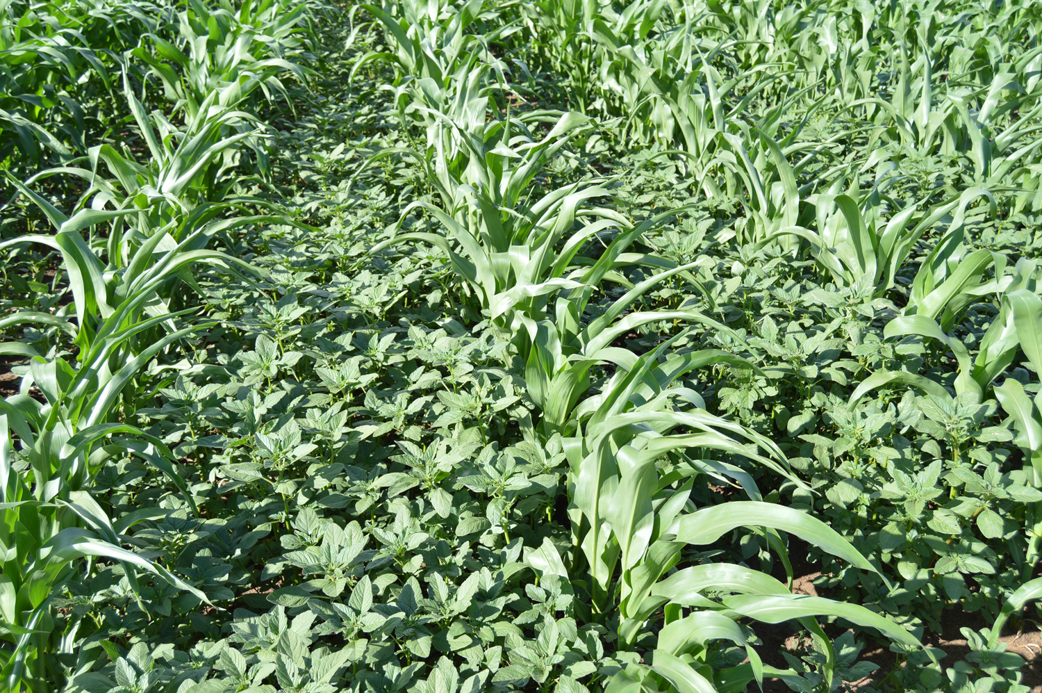 Amaranthus hybridus (gewone misbredie) wat op hierdie groeistadium reeds beheer moes gewees het. Toediening van na-opkomsonkruiddoders op ’n gevorderde groeistadium van die onkruid bevorder die ontwikkeling van weerstand oor tyd. (Foto: C Reinhardt)