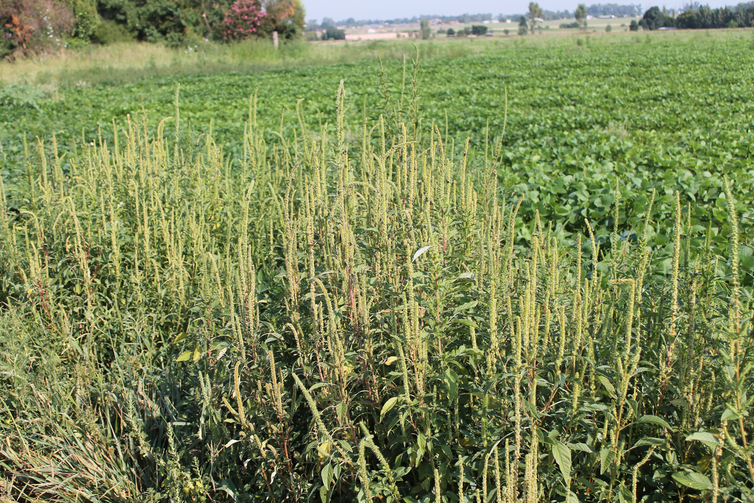Amaranthus palmeri (Palmer amarant) in ’n sojaboonland, Potchefstroom-distrik. (Foto: C Reinhardt)