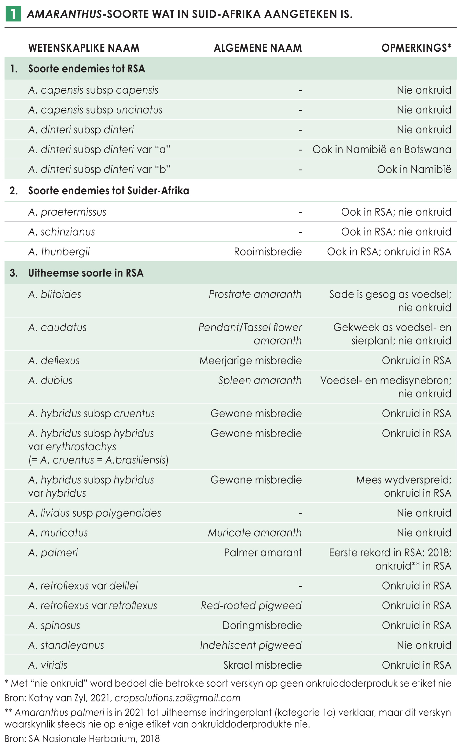 Onkruiddoders is vir die beheer van spesifieke onkruidsoorte geregistreer. ’n Lys van sodanige soorte is uiteraard ’n belangrike deel van elke onkruiddoder se etiket. Met die nagaan van ’n RSA-inligtingstuk van 2021 getitel “Weeds common in crops and the herbicides that control them” deur Kathy van Zyl (cropsolutions.za@gmail.com), het die skrywer die volgende inligting onttrek. Nege Amaranthus-soorte word vermeld wat op die etikette van sekere geregistreerde onkruiddoders verskyn. Vir twee van die nege soorte word uitgediende name gebruik, en wel A. brasiliensis wat lankal A. cruentus geword het, asook A. chlorostachys wat ’n ou sinoniem is vir A. hybridus. Amaranthus palmeri is in 2021 tot uitheemse indringerplant (kategorie 1a) verklaar, maar dit verskyn waarskynlik steeds nie op enige onkruiddoderproduk se etiket nie. Hopelik word die nodige dringende navorsing egter wel gedoen. In die geval van A. retroflexus is ’n enkele onkruiddoderproduk geregistreer, en daar is ook etikette wat verwys na “Amaranthus spp”; dit veronderstel al die soorte het dieselfde mate van gevoeligheid teenoor ’n bepaalde onkruiddoder, wat waarskynlik ’n onrealistiese verwagting is.
