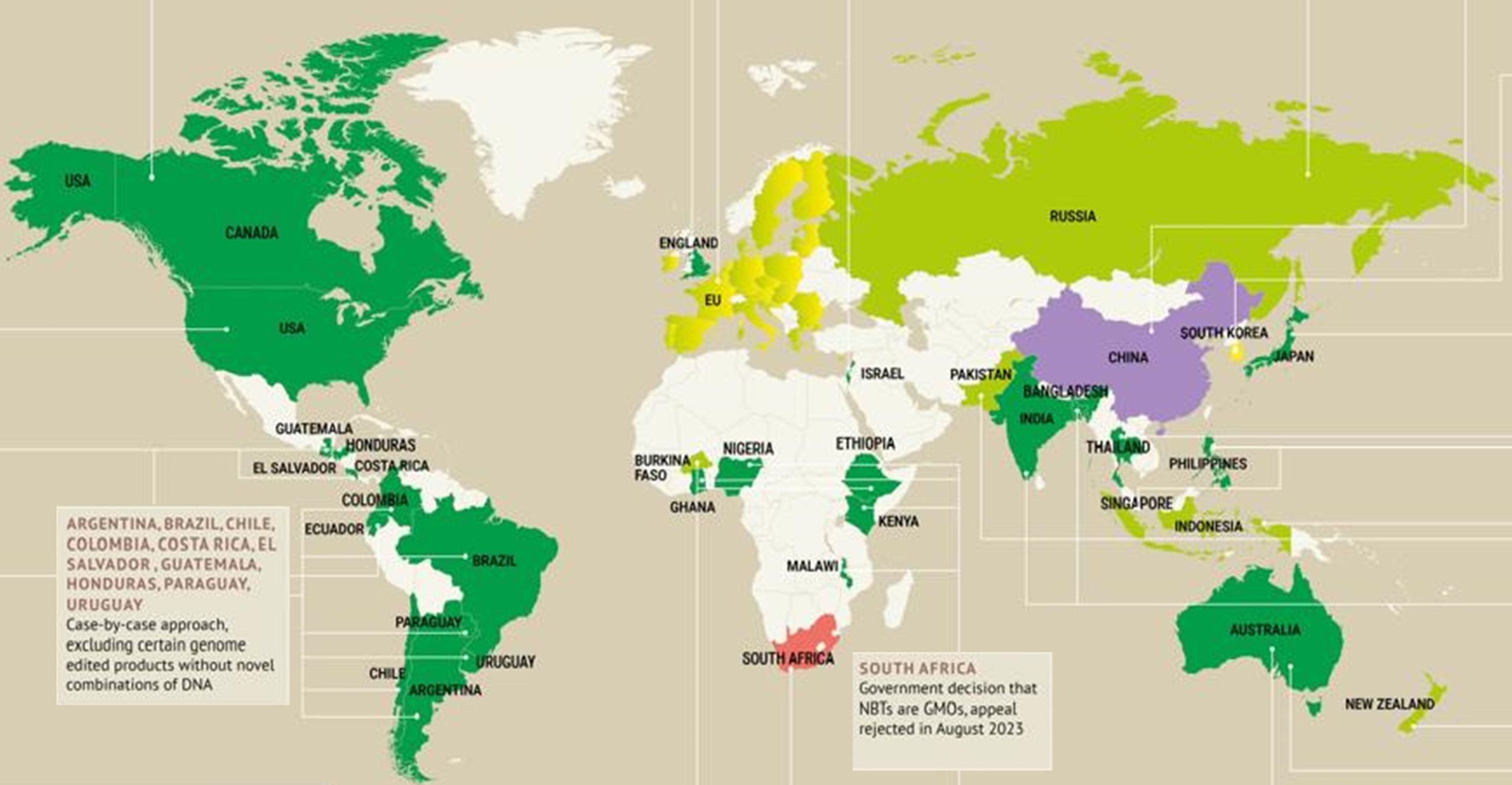 However, South Africa remains the only jurisdiction to explicitly state that all products derived from NBTs will be regulated entirely under the existing Genetically Modified Organisms Act (the GMO Act No. 15 of 1997). This was clarified by the Department of Agriculture (previously known as DALRRD) in 2021, confirming that the extensive risk-assessment processes and approval pathways required under the GMO Act will apply to NBTs. This decision was then appealed, but the appeal got rejected in 2023.