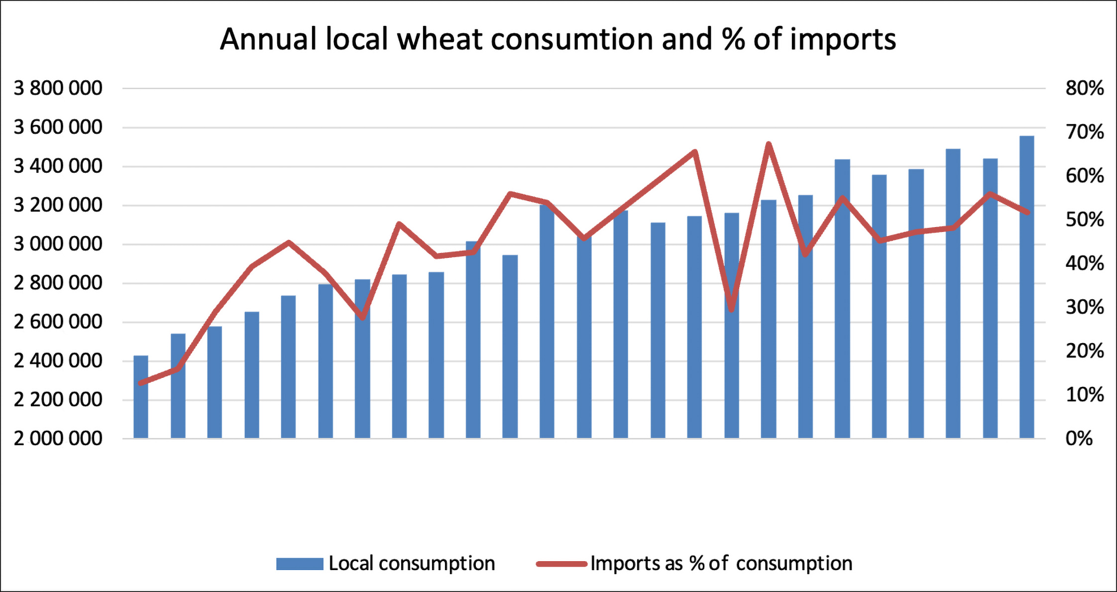 Graph 1: Annual local wheat consumption and percentage of imports.