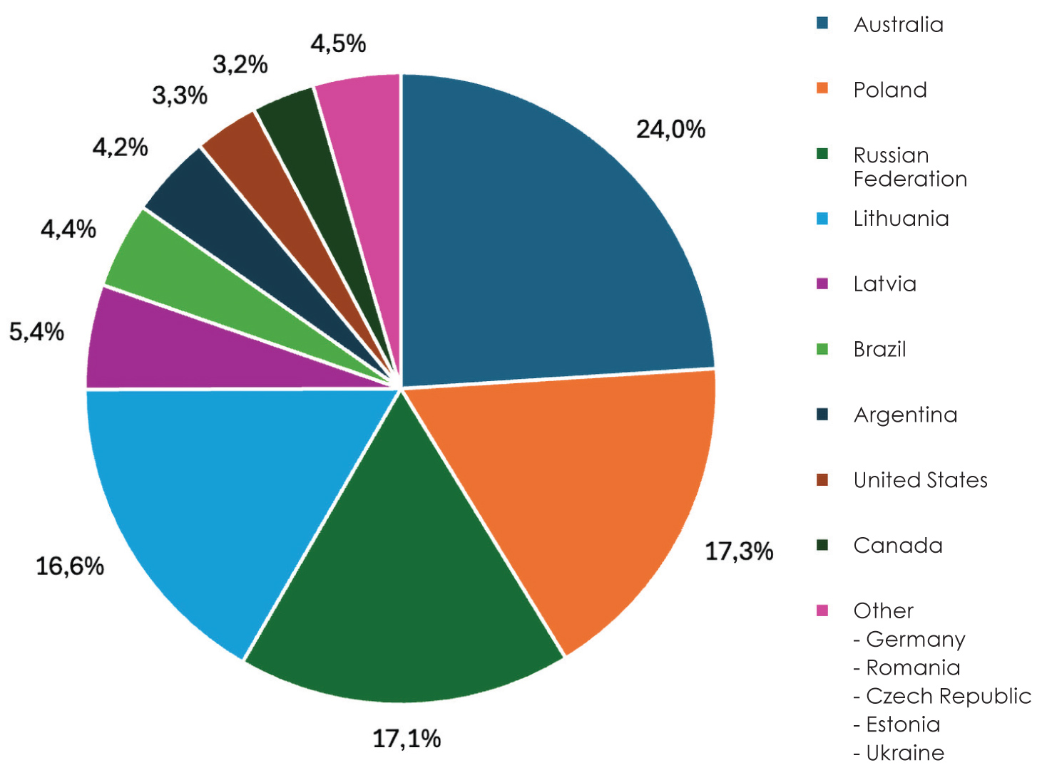Major supplying countries in recent years have included Australia, Lithuania, Poland, and Russia; preference and arrival patterns vary due to the harvesting time per country as well as global price trends.