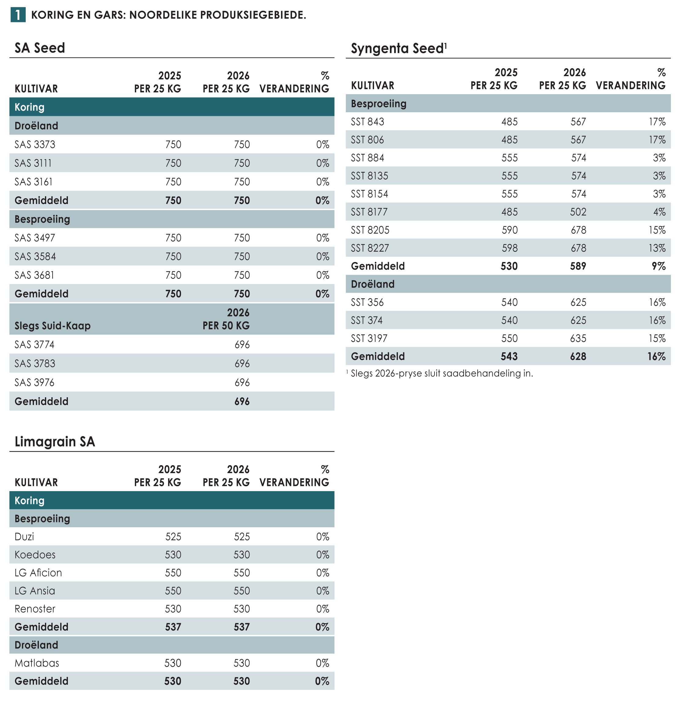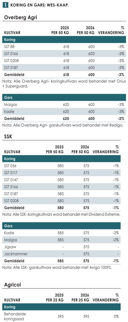 Tabel 1 dui wintergraansaadpryse vir 2026 in rand aan. Die maatskappye wat deelgeneem het sluit in SA Seed, Syngenta, Limagrain SA, Overberg Agri, SSK en Agricol.