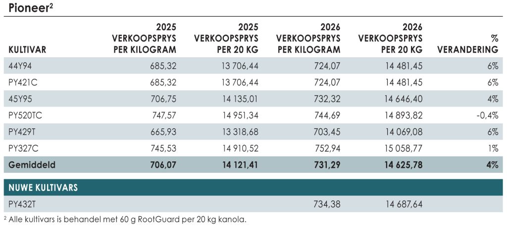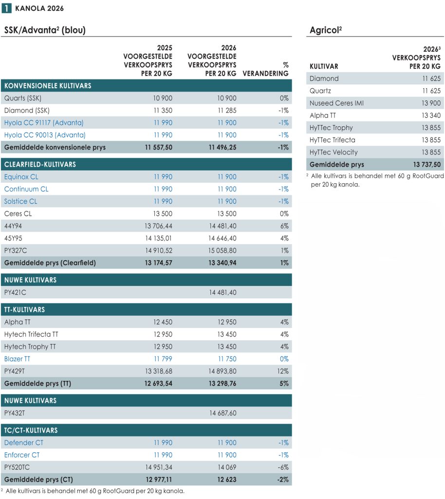 Koringsaadpryse het in 2026 met gemiddeld 1,6% gestyg. Sommige maatskappye se kultivars het selfs gedaal, terwyl ander maatskappye se kultivars in geheel dieselfde gebly het.