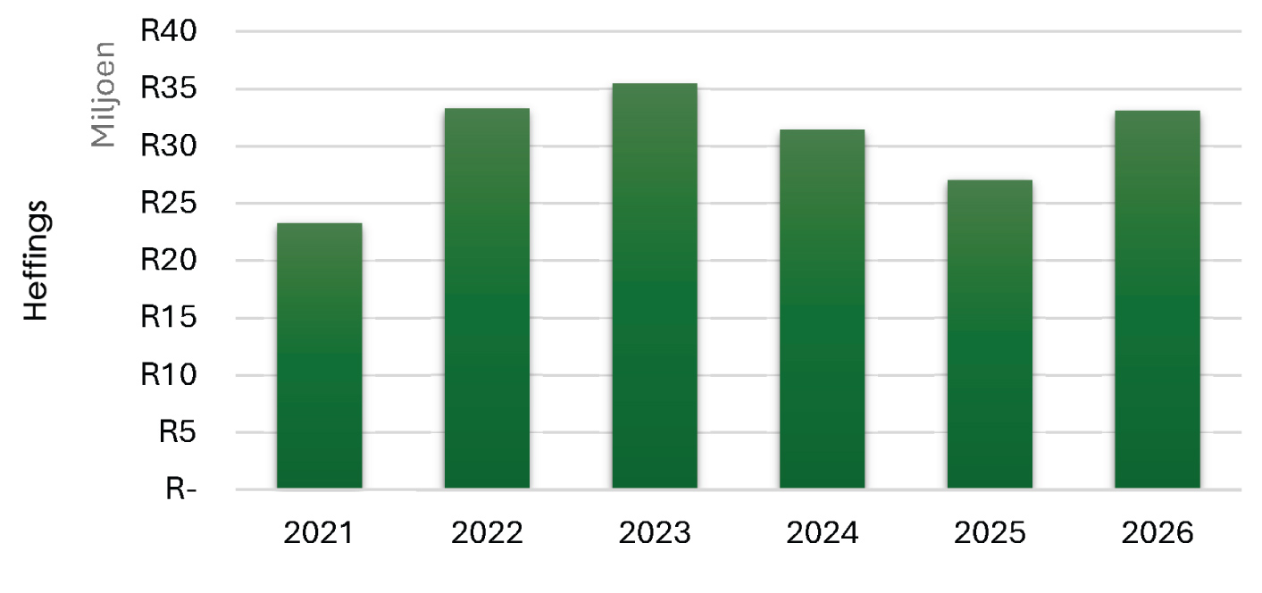 Krige het daarop gewys dat Graan SA een van die laagste hef­fings in die landbousektor het. Die organisasie het dit gaan toets en is gemaklik met die vlak waarop dit is. Gegewe die geskiedenis van hef­fingsinvorderings oor die tydperk 2021 tot 2026 was daar stabiliteit ra­kende die tonne graan waarop die heffing gevorder is (sien Grafiek 1).