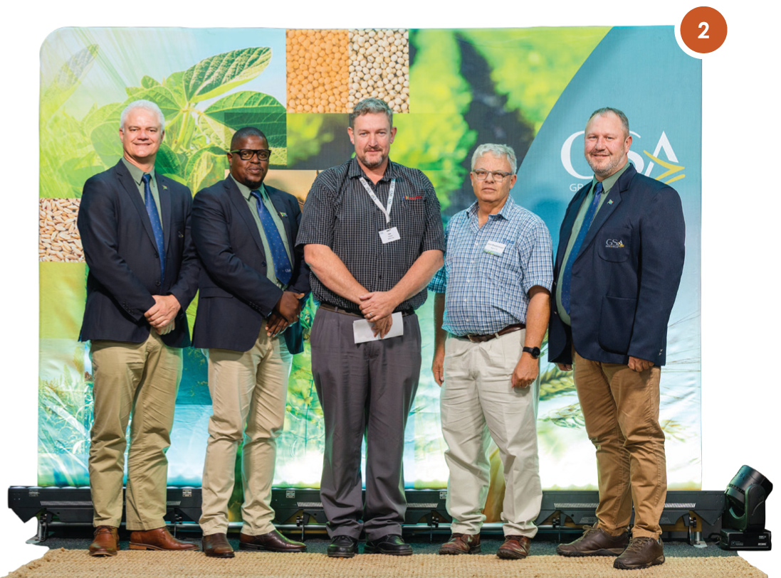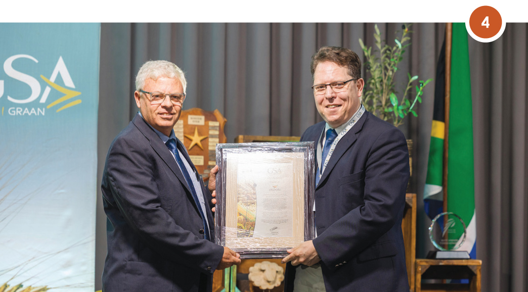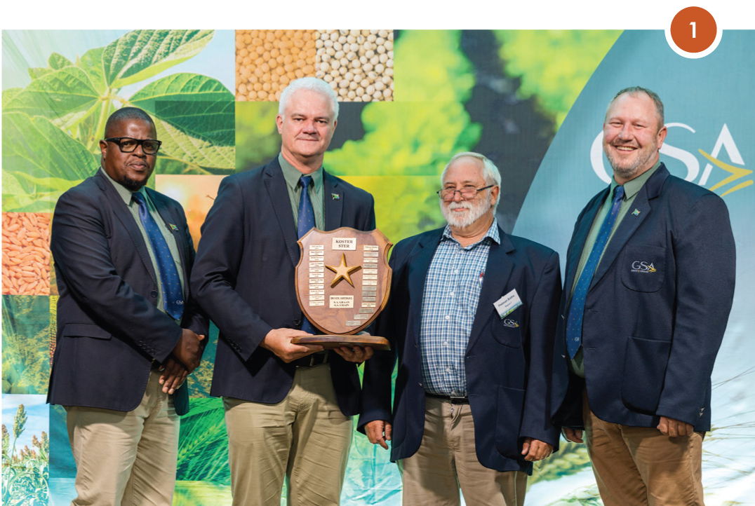 Die Koster-skild word jaarliks deur die Koster Studiegroep aan die skrywer van die beste artikelreeks in SA Graan/Grain toegeken. Dit is vanjaar aan dr Tobias Doyer toegeken vir sy maandelikse Hoofartikel uit die hoof- uitvoerende beampte se stoel. V.l.n.r. is Jeremia Mathebula, dr Doyer, Pietman Botha (Streek 7) en Richard Krige.SA Graan/Grain wys maandeliks ’n wenartikel aan wat aan sekere kriteria voldoen. Die maandwenners dring outomaties deur na die groep artikels waaruit ’n algehele wenartikel aan die einde van die jaar gekies word. Die hoeveelheid kere wat die artikel op die webwerf (sagrainmag.co.za) gelees word, word as riglyn gebruik om die wenartikel te bepaal. Dons Jordaan (middel), bemarkingsbestuurder van Bastion, se artikel, “Grondversuring: SA het ’n krisis”, is as algehele wenner aangewys. By hom is dr Tobias Doyer, Jeremia Mathebula, Jaco Breytenbach (Redaksiekomitee-voorsitter) en Richard Krige.Daar word jaarliks tydens Kongres ’n spreker deur lede van die media aangewys wat die beste bydrae van die vloer af gelewer het. Vanjaar se prys is toegeken aan Koos Blanckenberg van Streek 26 wat sy kommer uitgespreek het oor die vervoerdifferensiaal en ‘n pleidooi gelewer vir ’n regverdige markplek vir elke produsent asook definitiewe antwoorde aan graanprodusente.Infoworks Media Publishing is vereer vir 25 jaar se ononderbroke dienslewering aan Graan SA vir die maandelikse publisering van SA Graan/Grain, die NAMPO-hekprogram, Pula Imvula, die Graan SA-jaarverslag en -kongresagenda en die uitgee van die boek, Die Graan- en Oliesadebedryf van Suid-Afrika – ’n Reis deur Tyd. Hier ontvang Johan Smit (regs), besturende direkteur, die toekenning van Jaco Breytenbach, voorsitter van die SA Graan/Grain-redaksiekomitee.’n Eretoekenning is aan professor Marena Manley oorhandig vir die werk wat sy as navorser in voedselwetenskap doen. Sy het beduidende bydraes gelewer tot die bevordering van naby-infrarooi- (NIR-)spektroskopie en hiperspektrale beeldvorming (HSI), veral in graannavorsing, wat verseker dat produsente en verwerkers toegang het tot betroubare hulpmiddels vir gehaltebepaling.