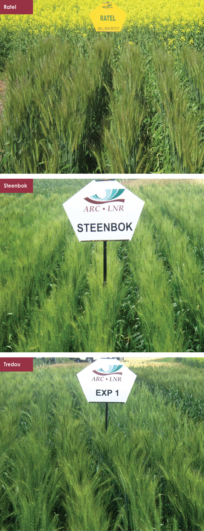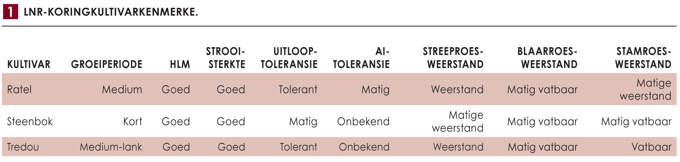 Die LNR-Kleingraan het tans drie kommersiële koringkultivars, naamlik Ratel, Steenbok en Tredou (Figuur 1 en Tabel 1) wat elke jaar ingesluit word by die nasionale kultivarevalueringsproewe van die Departement Landbou by Elsenburg. Ratel het ’n mediumgroeiperiode terwyl Steenbok ’n kort groeiperiode het met goeie droogtetoleransie wat dit ’n goeie kultivarkeuse maak in areas met ’n droër klimaat. Met die voortdurende klimaatsverandering en droë seisoene wat meer gereeld voorkom, is Steenbok ’n uitstekende kultivarkeuse om risiko te bestuur. Tredou is die jongste toevoeging tot die LNR-Kleingraan se kultivars en het ’n medium- tot lang groeiperiode.