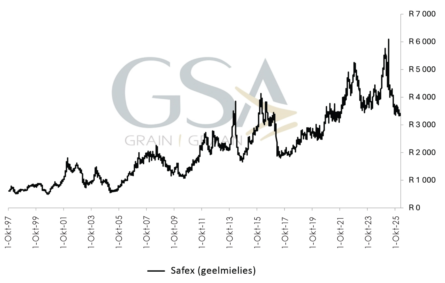 Die geskiedenis wys dat graanpryssiklusse wel draai. Grafiek 2 toon die langtermynpryssiklus van geelmielies aan. Op die grafiek is daar duidelike tendense wat toon hoe pryse deur opwaartse en afwaartse siklusse beweeg. Van die grafiek leer ons dat die tydperk van siklusse wissel tussen so kort soos een jaar en amper vier jaar voor die draaipunt kom. Die uitdaging van die huidige siklus is juis dat dit al uiters lank aanhou en dat die impak van globale faktore groter as voorheen is. Tog is dit belangrik om te onthou dat geen siklus permanent is nie. Die vraagstuk vir produsente is dus minder wanneer die siklus draai en meer hoe hulle die pad tot daar volhoubaar kan bestuur.