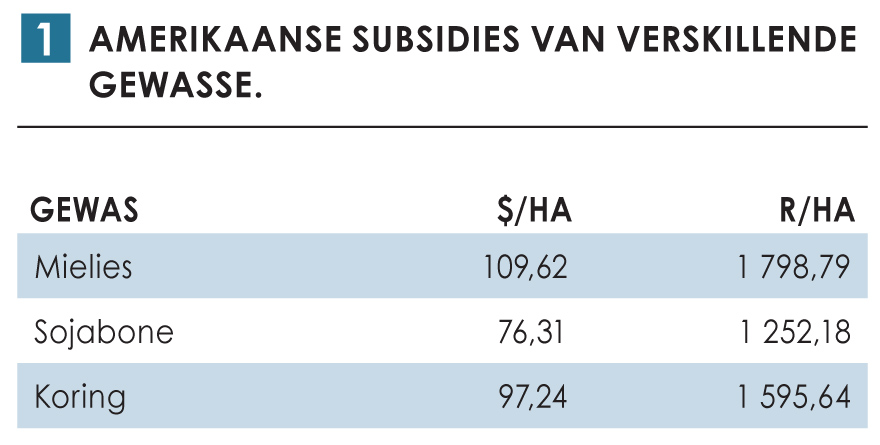 Vir ’n land soos Suid-Afrika, waar pryse grootliks deur internasionale markte bepaal word, skep dit ’n omgewing waar die wêreldprys onder druk bly en plaaslike pryse beweeg daarmee saam. Tabel 1 wys die subsidies wat Amerikaanse produsente ontvang vir mielies, sojabone en koring.